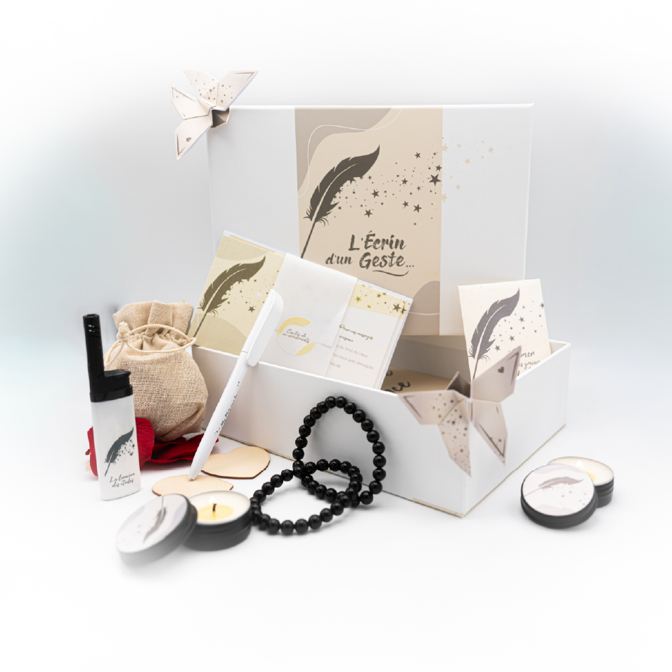 Les bougies permettent d’instaurer un rituel lumineux et apaisant, tandis que le livret « Édition Marabout » soutient les proches dans leurs mots et leurs souvenirs. Les bracelets inclus dans le coffret deviennent un symbole tangible du lien qui demeure, un objet à porter comme un rappel discret et intime.
